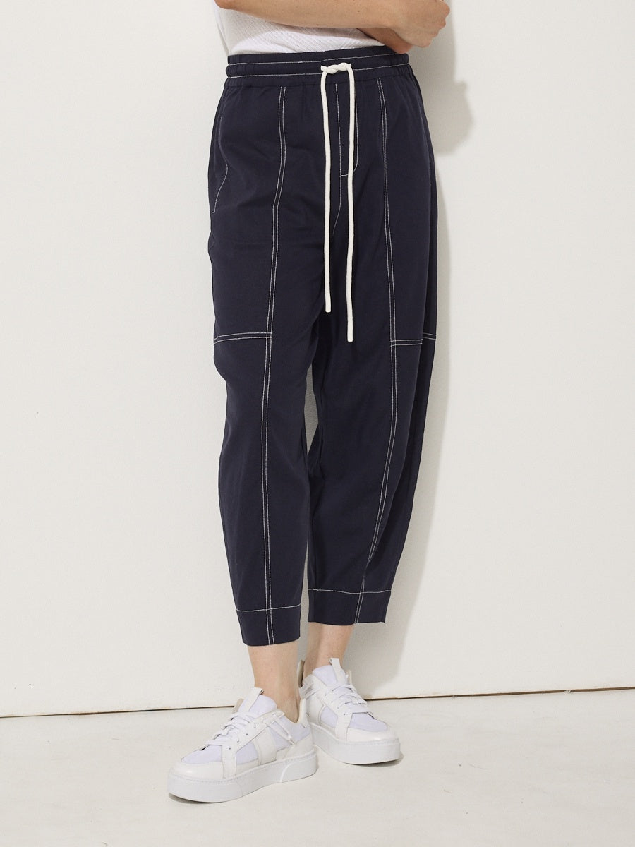 This Marco polo Jogger is a must have for your summer wardrobe with its detailed white stitiching and slim barrel leg. 55 % linen 43 % Viscose