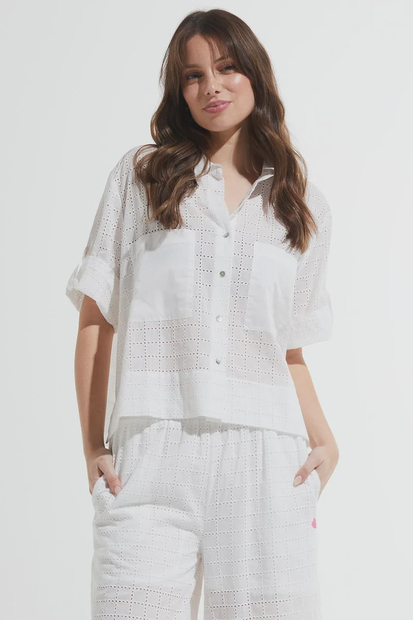Experience dreamlike comfort and style with the Zaket and Plover In Your Dreams Button Front Eyelet Lace Shirt. Crafted with exquisite eyelet lace, this shirt features a button front and convenient pockets.