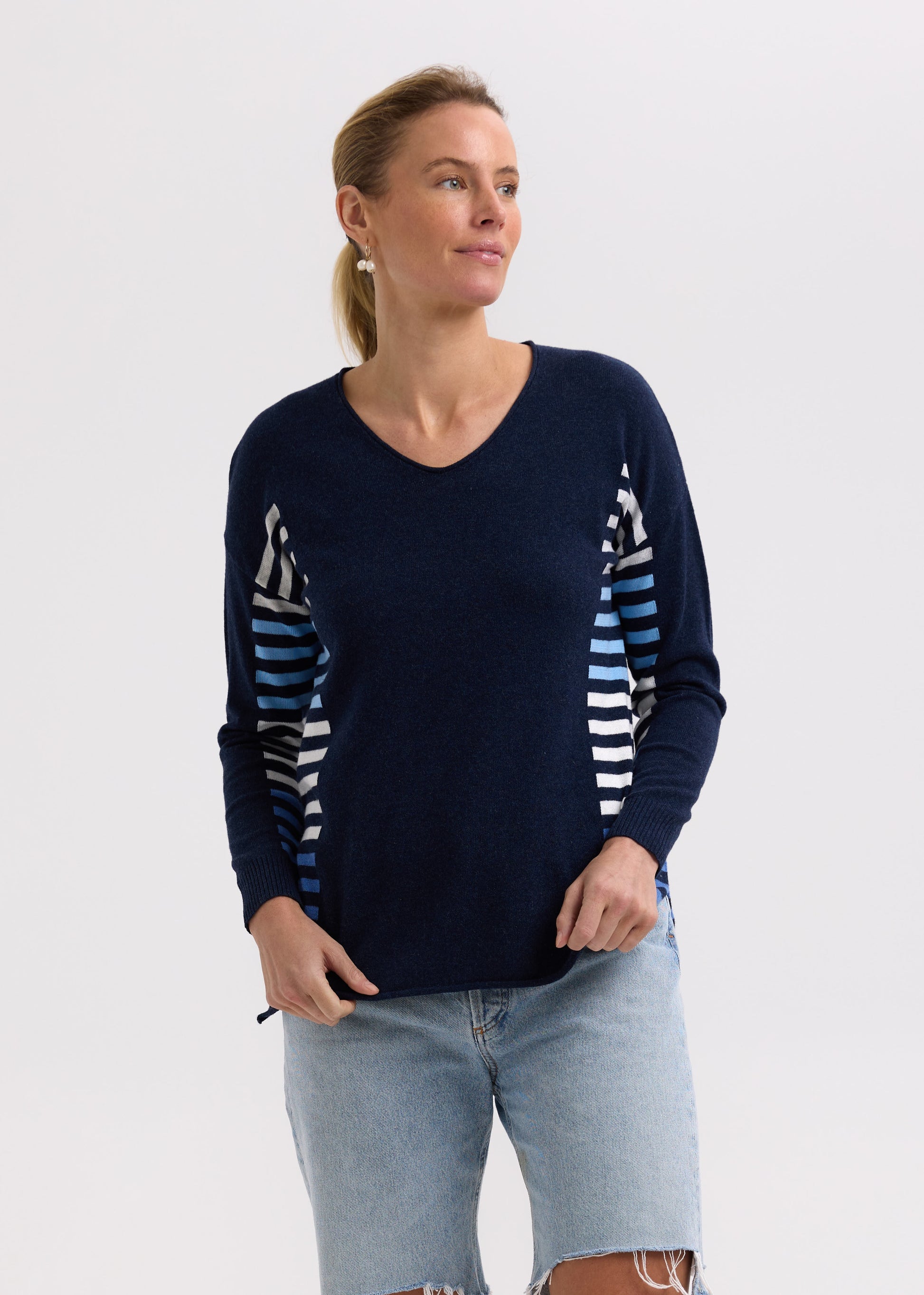 This knit is made to complement the pieces you already own. It features a slightly A-line cut and flattering side stripes, while the solid centre creates an elongating effect. Perfect for adding a touch of colour to your wardrobe!